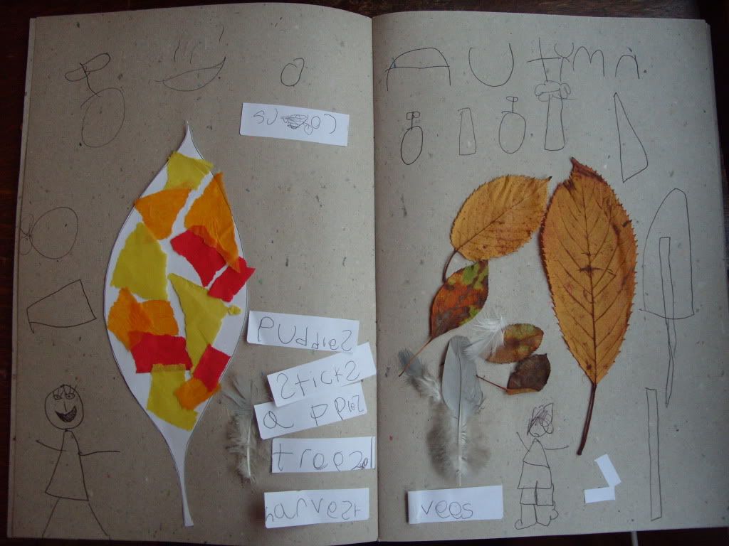 An activity that has become one that my daughter enjoys immensely is filling in our family seasonal scrapbook. She is very particular about what she likes to put in it and doesn't really like to listen to my suggestions but the important thing is that it really gets her thinking about and discussing the seasonal changes that can otherwise easily pass us by. Above is her first exploration of autumn.